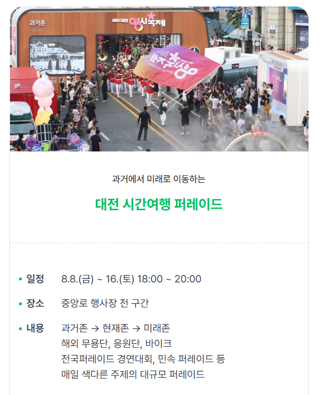 - 기간·장소: 중앙로(대전역 ~ 옛 충남도청) 및 원도심 일원 — 행사 기간은 공식 공지 참조.