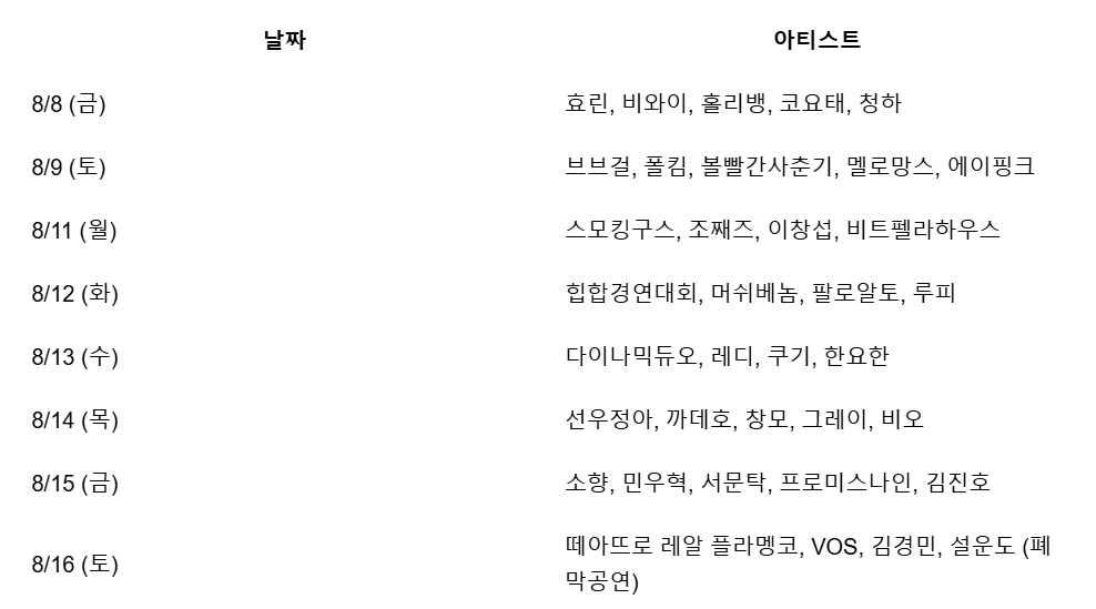 - K-POP/팝스 스테이지: 청하·효린·코요태·비오·비와이 등 인기 아티스트 출연(날짜별 상이).